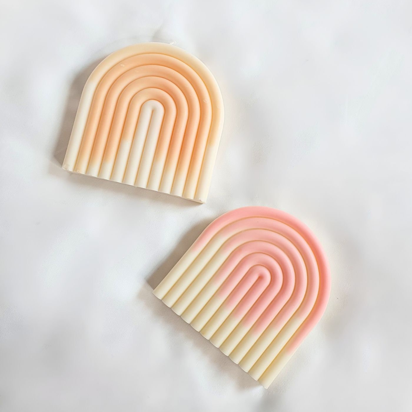 Enhance your interior with our large arch-shaped candle, handmade with natural, vegetable wax and a cotton wick. Its graceful curves evoke a rainbow, adding a cozy touch to your decoration. Each two-tone Arch candle is totally unique, colored and shaded by hand.